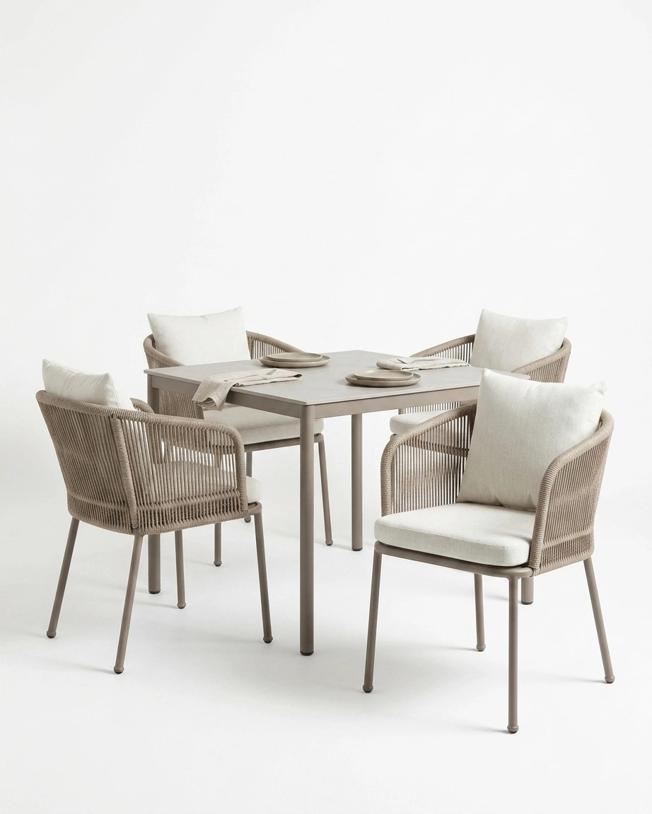 Crafted using weather-resistant materials, this dining set ensures durability while maintaining a refined and modern look. Its balanced design enhances both functionality and aesthetics in outdoor environments.