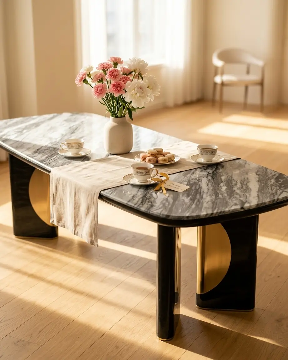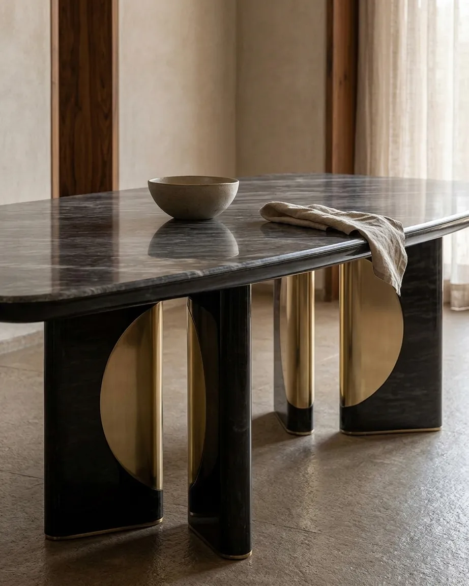 Luxury marble dining table by Craftnika is designed to create a bold and sophisticated dining space. The Verluxe Dining Table features a premium black marble top paired with a strong modern base, offering a high-end aesthetic.